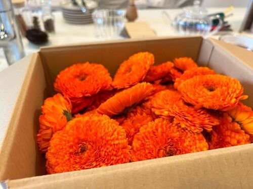 教室をしばらく閉じますという報告から 受講生はもちろん一般の方からの問い合わせに日々忙殺されております。 そんな中、届いた鮮やかなオレンジ色のカレンデュラ(トウキンセンカ)、廣田農園さんの品種は「むらじ」です。 山陰でハーブを育てている友人か…